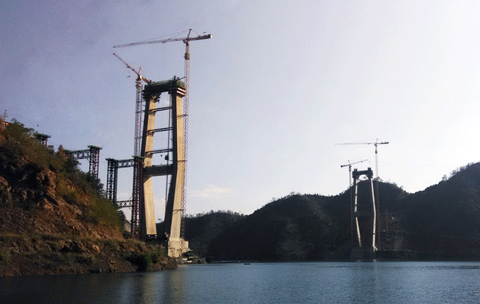 紅水河特大橋兩側橋墩高度均為210米,每個橋墩的起重機械配置均為川建生產(chǎn)的一臺C7036塔機、一臺C7030塔機和兩臺SC200/200WPZ中速變頻施工梯,副墩的施工機械為一臺P125平頭式塔機。