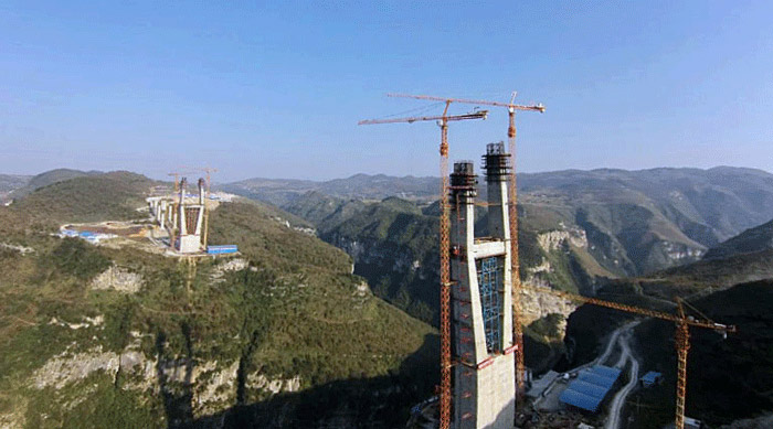 六廣河特大橋是息黔高速公路最為重要,同時也是施工難度最大的控制性工程,兩側(cè)橋墩高度均為242米,每個橋墩的起重機械配置均為川建生產(chǎn)的兩臺C7030塔機和兩臺SC200/200WPZ中速變頻施工梯。